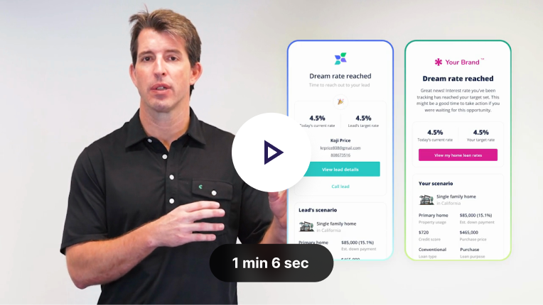 Dream Rate allows you to set a target interest rate for a lead or a closed loan. BankingBridge continuously monitors live pricing, and when that target rate becomes available, both you and the borrower are automatically notified. You can manually enroll leads into Dream Rate.